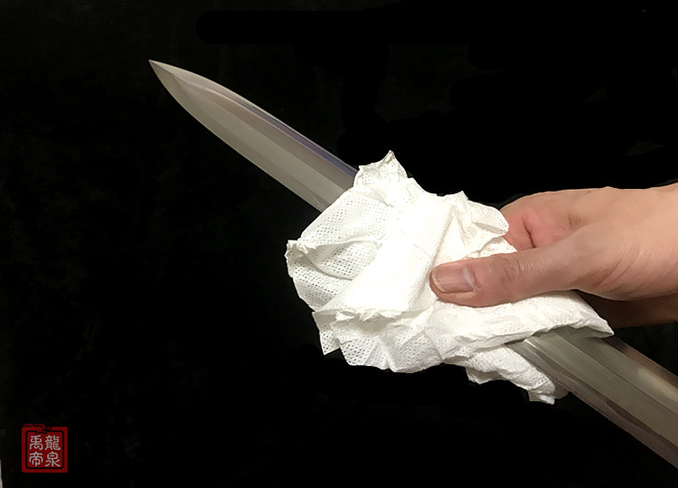 Wiping Sword (Knife): Use a pure cotton towel, velvet cloth, or deer skin to gently wipe off any remaining oil and dust on the sword (knife) body. Then, use cotton yarn dipped in a small amount of wiping oil to evenly apply the sword body. After three minutes, use the original cotton cloth to wipe back and forth for about 2-3 minutes, making sure that the sword (knife) body is warm. The purpose is to remove impurities on the blade surface and promote chemical changes in phosphorus and calcium, which will naturally add phosphorus and fill the fine pores on the sword (knife) body. At this point, it is important to concentrate and avoid being cut or poked.